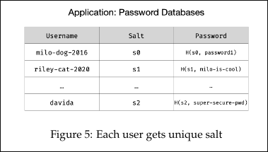 - if use same salt for every user in the database and more than 1 person ahs the same password ⇒ the adversary would know more people’s passwords ⇒ each user has unique salt ⇒ if 2 users have same password, the value stored in teh password would be different because different salts are used with hash function.